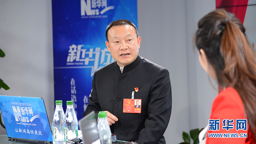 3月7日,全國人大代表、河南省信陽市文新茶葉有限責任公司董事長劉文新(左)做客新華網(wǎng)2018全國兩會特別訪談。新華網(wǎng) 楊濛攝
