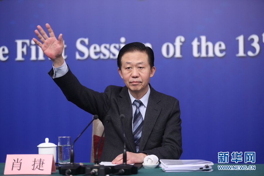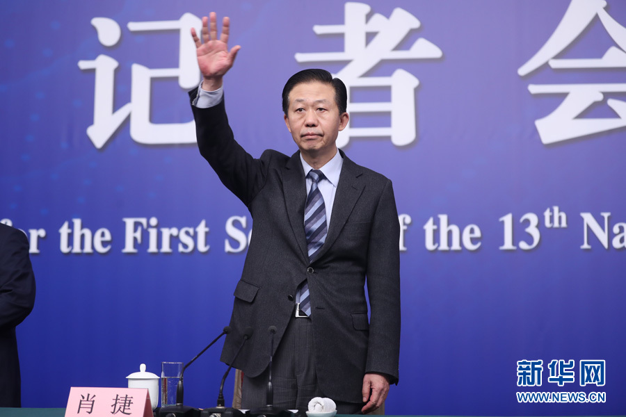 十三屆全國人大一次會議新聞中心于3月7日上午在梅地亞中心多功能廳舉行記者會,邀請財政部部長肖捷,副部長史耀斌、胡靜林就“財稅改革和財政工作”相關問題回答中外記者提問。圖為財政部部長肖捷向記者舉手示意。新華網(wǎng)/中國政府網(wǎng) 翟子赫 攝