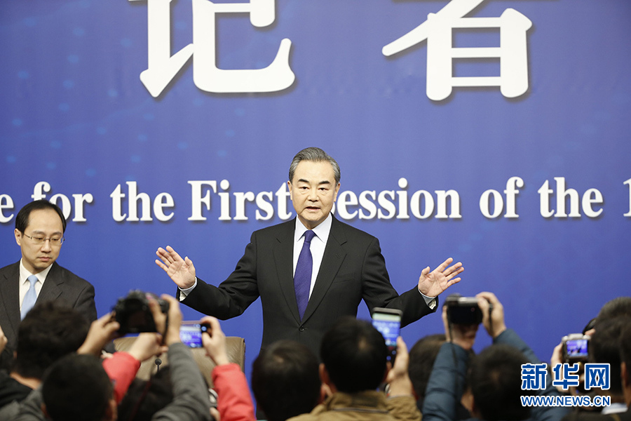 十三屆全國人大一次會議新聞中心于3月8日上午10時(shí)在梅地亞中心多功能廳舉行記者會,邀請外交部部長王毅就“中國外交政策和對外關(guān)系”回答中外記者提問。圖為王毅向記者示意。新華網(wǎng)/中國政府網(wǎng)陳杰 攝