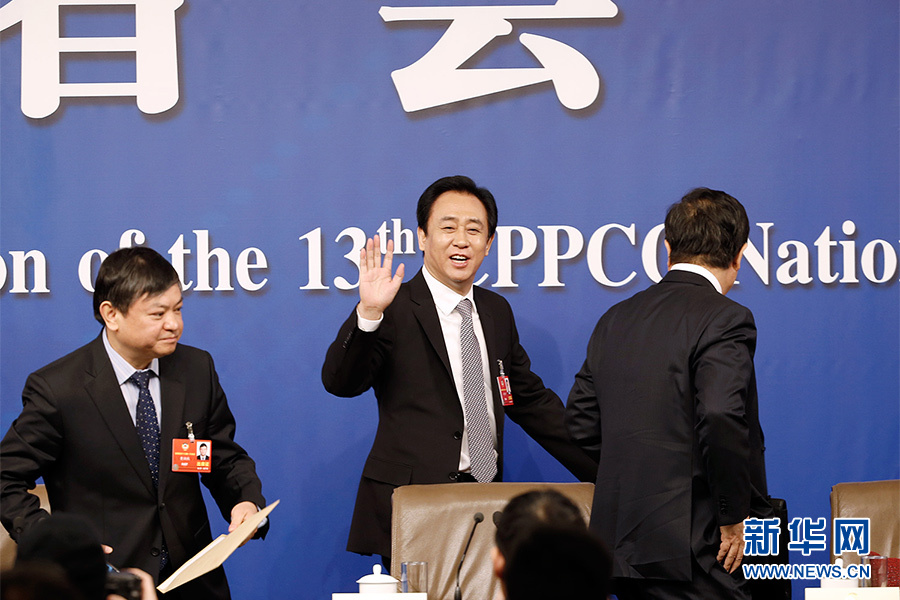 3月10日8時(shí)45分,全國(guó)政協(xié)十三屆一次會(huì)議在梅地亞中心多功能廳舉行記者會(huì),邀請(qǐng)5位全國(guó)政協(xié)委員就“提高保障和改善民生水平”回答記者提問。圖為記者會(huì)結(jié)束后,許家印與記者們揮手告別。新華網(wǎng)/中國(guó)政府網(wǎng) 翟子赫 攝
