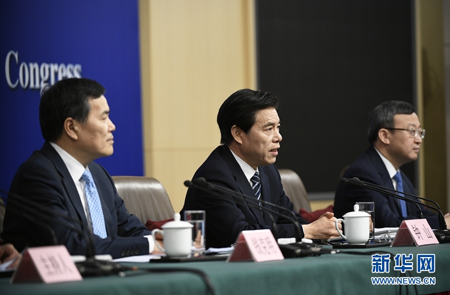 3月11日,十三屆全國人大一次會(huì)議新聞中心舉行記者會(huì),邀請商務(wù)部部長鐘山、副部長兼國際貿(mào)易談判副代表王受文、副部長錢克明就“推動(dòng)形成全面開放新格局推動(dòng)商務(wù)事業(yè)高質(zhì)量發(fā)展”相關(guān)問題回答中外記者提問。 新華社記者 王鵬 攝