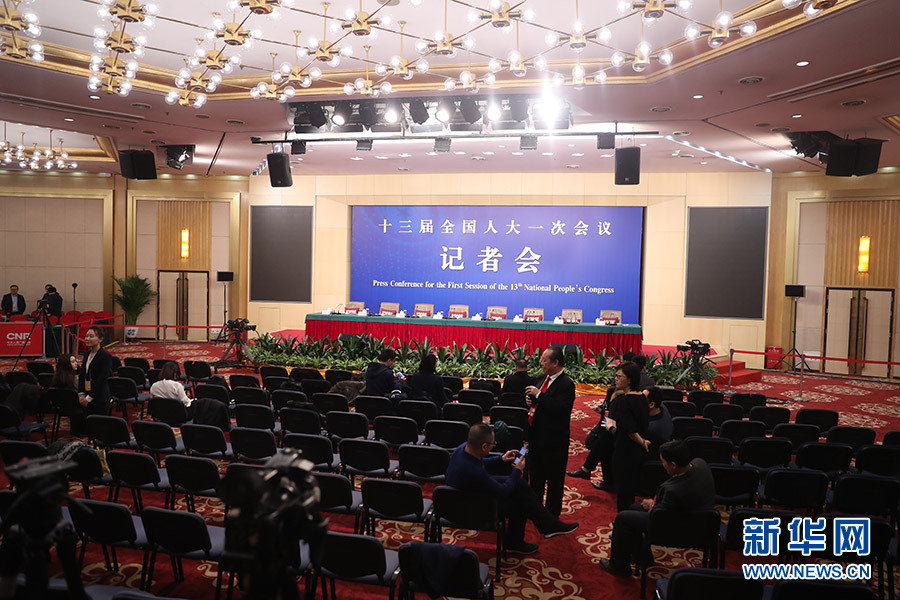 3月12日,十三屆全國人大一次會議新聞中心在梅地亞中心多功能廳舉行記者會,邀請十二屆全國人大內(nèi)司委副主任委員王勝明、財經(jīng)委副主任委員烏日圖、教科文衛(wèi)委副主任委員吳恒、環(huán)資委委員呂彩霞,全國人大常委會法工委副主任王超英、副主任許安標(biāo)就“人大立法工作”相關(guān)問題回答中外記者提問。圖為記者會開始前。新華網(wǎng)/中國政府網(wǎng) 翟子赫 攝