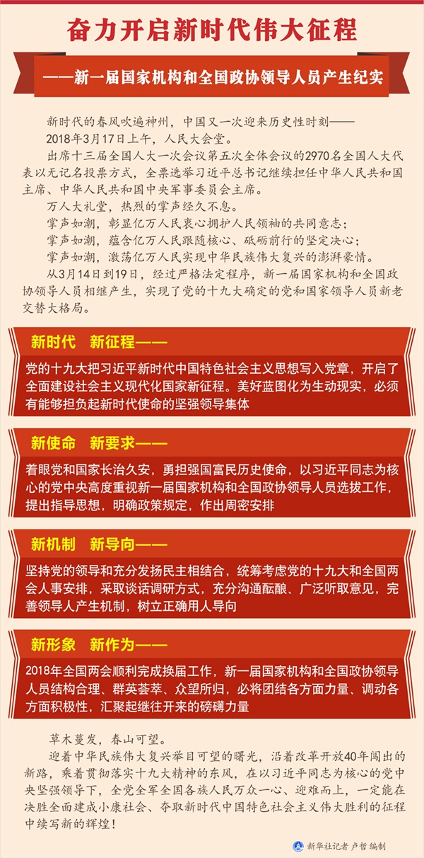 從3月14日到19日,經(jīng)過嚴(yán)格法定程序,新一屆國(guó)家機(jī)構(gòu)和全國(guó)政協(xié)領(lǐng)導(dǎo)人員相繼產(chǎn)生,實(shí)現(xiàn)了黨的十九大確定的黨和國(guó)家領(lǐng)導(dǎo)人員新老交替大格局。