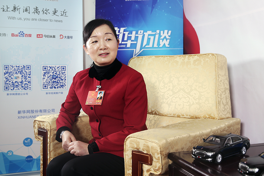 全國人大代表劉光萍到新華網(wǎng)人民大會堂兩會特別訪談間接受專訪。新華網(wǎng) 郝廣鵬 攝