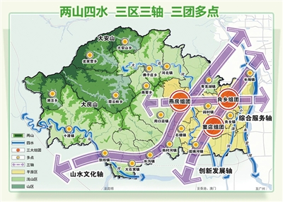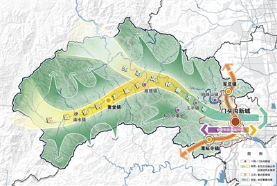 門(mén)頭溝空間結(jié)構(gòu)為“一城、兩帶、三點(diǎn)、多脈”。