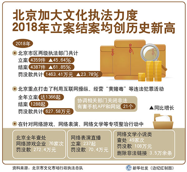圖表:北京加大文化執(zhí)法力度 2018年立案結(jié)案均創(chuàng)歷史新高 新華社發(fā) 邊紀(jì)紅 制圖