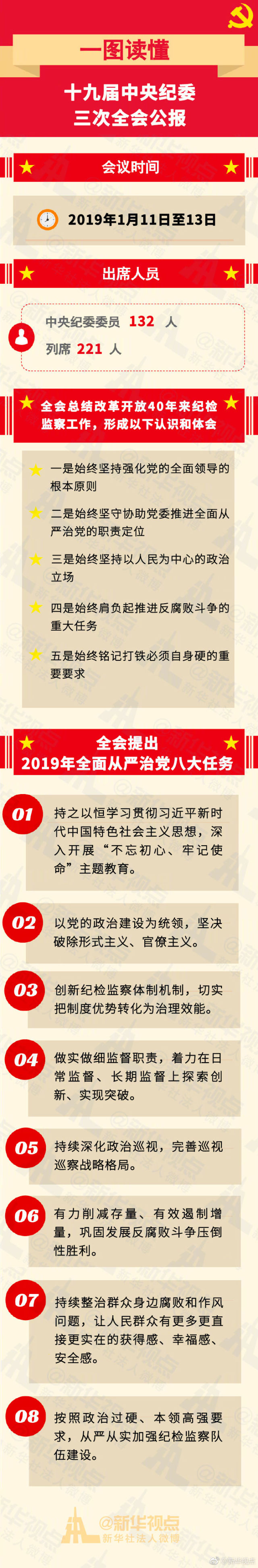 【一圖讀懂十九屆中央紀委三次全會公報】為期3天的十九屆中央紀委三次全會13日在北京閉幕。新華社受權發(fā)布了全會公報。此次中央紀委全會取得了哪些重要成果?對2019年全面從嚴治黨、黨風廉政建設和反腐敗斗爭又有哪些新的部署?詳情戳圖