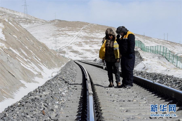 青藏鐵路格爾木工務(wù)段望昆線路養(yǎng)護(hù)車間副主任于本蕃(右)和工友一起檢查軌道平順度(1月11日攝)。 新華社發(fā)(王浡 攝)