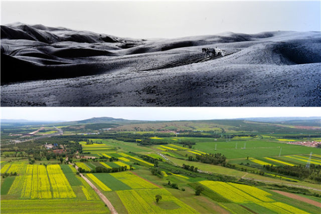 上圖為治理前,山西省右玉縣隨處可見(jiàn)半流動(dòng)沙丘(資料照片);下圖為山西省右玉縣威遠(yuǎn)鎮(zhèn)治理后的荒沙地,如今已郁郁蔥蔥。(新華社記者詹彥攝·2017年)