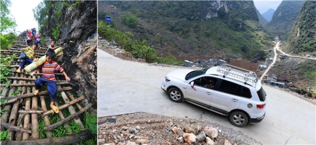 右圖:修通水泥路之后,弄頂屯的家長(zhǎng)開(kāi)著汽車(chē)去學(xué)校接孩子回家。(新華社記者黃孝邦攝·2017年)。