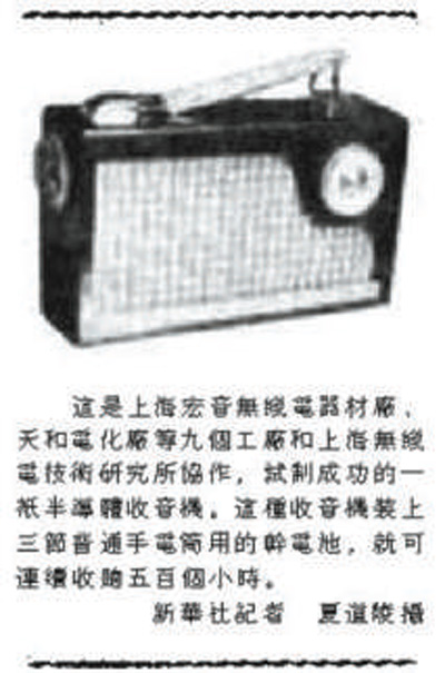 ??? 編者按: 1958年3月13日,人民日報報道我國第一臺半導(dǎo)體收音機(jī)在上海誕生。