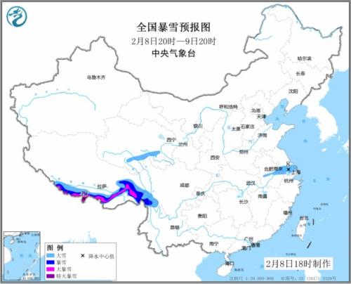 2月8日20時(shí)至9日20時(shí),青藏高原東部和南部、甘肅中部和南部、蘇皖大部等地的部分地區(qū)有中到大雪或雨夾雪,其中,西藏南部和東部的部分地區(qū)有暴雪,局地有大暴雪或特大暴雪(30~40毫米)。西藏東南部、江南大部、西南地區(qū)東部和華南北部等地有小到中雨,其中,西藏東南部、云南西北部等地局地有大雨或暴雨(25~80毫米)。西藏中西部、華北北部、遼東半島、江漢、江南東北部等地的部分地區(qū)有4~6級風(fēng)。