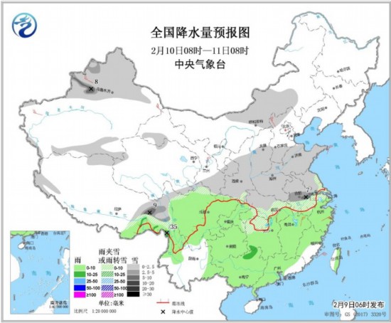2月9日08時(shí)至10日08時(shí),西藏中東部、西北地區(qū)中東部、華北南部和川西高原北部等地的部分地區(qū)有中到大雪或雨夾雪,西藏東部和南部、甘肅中南部和陜西中部等地的部分地區(qū)有暴雪,西藏南部局地有大暴雪。西南地區(qū)東部、江南、華南等地有小雨,西藏東南部有中到大雨,局地暴雨。內(nèi)蒙古中部、遼寧中部、甘肅河西、河北北部、天津中部、山東半島、湖北北部和江西北部等地的部分地區(qū)有4~5級(jí)風(fēng)(見圖2)。