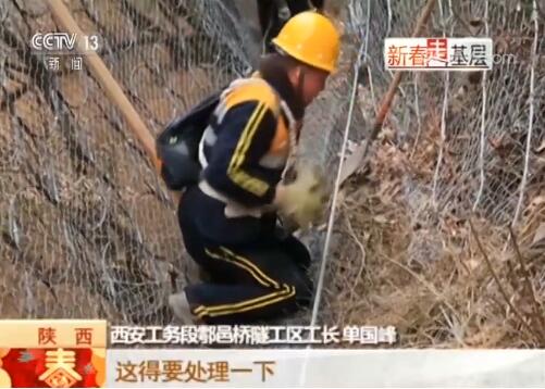 西安工務段漢中橋隧車間鄠邑橋隧工區(qū)工長 單國峰:這得要處理一下,滑落下來了,到了第一道網(wǎng),就要把它們?nèi)壳謇沓鋈?,防止?jié)L落到線路上去。找一個平一點的臺子,把它碼好、堆好,防止?jié)L落,有條件的情況下挖個坑給它掩埋了。