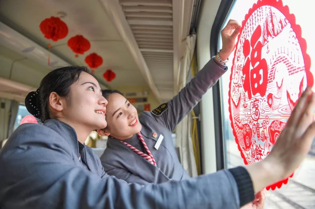 2019-01-29,江西省南昌市。南昌至北京西的Z68次列車上,乘務(wù)員在車上貼上窗花,為旅客準(zhǔn)備免費(fèi)書(shū)籍、玩具和春節(jié)物品等,營(yíng)造濃濃的年味兒。作者:清風(fēng)吹過(guò)60年