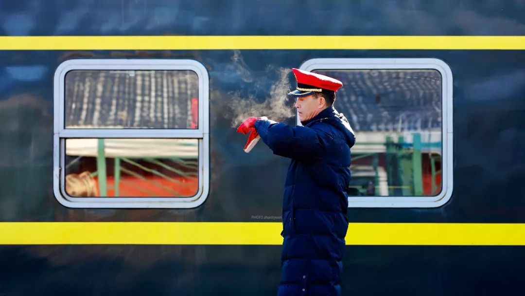 2019-01-31,吉林省白山市江源站。鐵路工作人員在發(fā)車前核對(duì)時(shí)間的瞬間。作者:了凡大叔