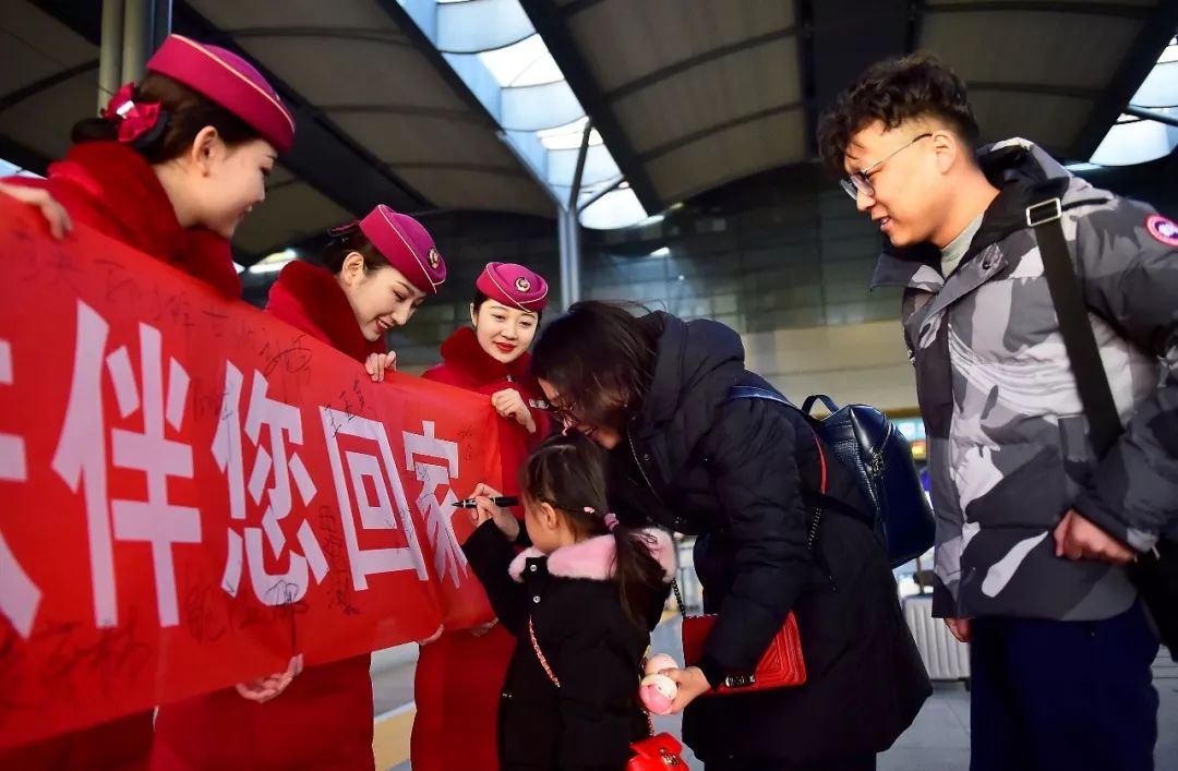 2019-02-03,天津西站。開(kāi)車前,旅客與列車乘務(wù)人員在天津西站站臺(tái)上共同寫(xiě)下新年祝福。作者:三木