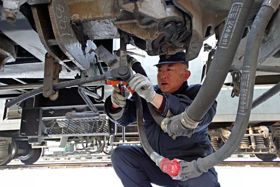 2019-02-08,唐山機(jī)務(wù)段。大年初四,唐山機(jī)務(wù)段的整備人員正在檢修機(jī)車走行部,確保出庫(kù)機(jī)車質(zhì)量良好。作者:樂(lè)亭閑人