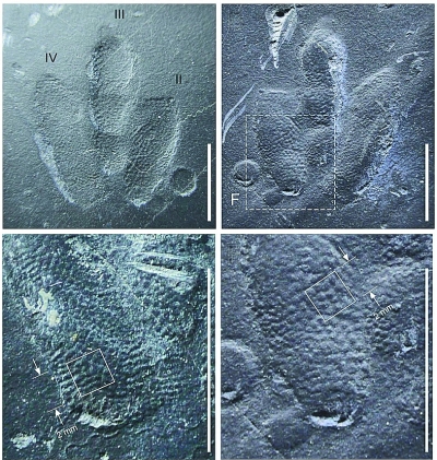 這些精致的小龍足跡一共有4個,組成了一道行跡,仿佛跨越了1億年的時空遇到人類?!靶↓堊阚E僅在韓國和中國發(fā)現(xiàn),是東亞白堊紀的特有足跡。這是世界上第10處發(fā)現(xiàn)有小龍足跡的化石點,也是首次發(fā)現(xiàn)這種足跡的皮膚印痕?!绷昼姁湼嬖V記者。此前,古生物學家從未發(fā)現(xiàn)過有如此完美的皮膚印痕,足跡上的鱗片痕跡平均直徑還不到0.4毫米,而且不同于此前的鱗片印痕僅出現(xiàn)在足跡的部分區(qū)域,小龍足跡保存了整個腳底的皮膚。