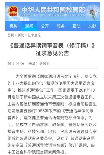 1985年,國家發(fā)布《普通話異讀詞審音表》,對一些異讀詞進(jìn)行了修訂。2016發(fā)布的《<普通話異讀詞審音表(修訂稿)>征求意見稿》又對一些讀音進(jìn)行了新的修訂,并發(fā)布在教育部網(wǎng)站上征求意見。