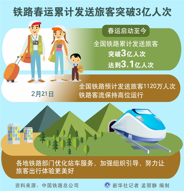 新華社北京2月21日電(記者樊曦)記者從中國鐵路總公司獲悉,春運(yùn)啟動至今,全國鐵路累計發(fā)送旅客突破3億人次,達(dá)到3.1億人次。