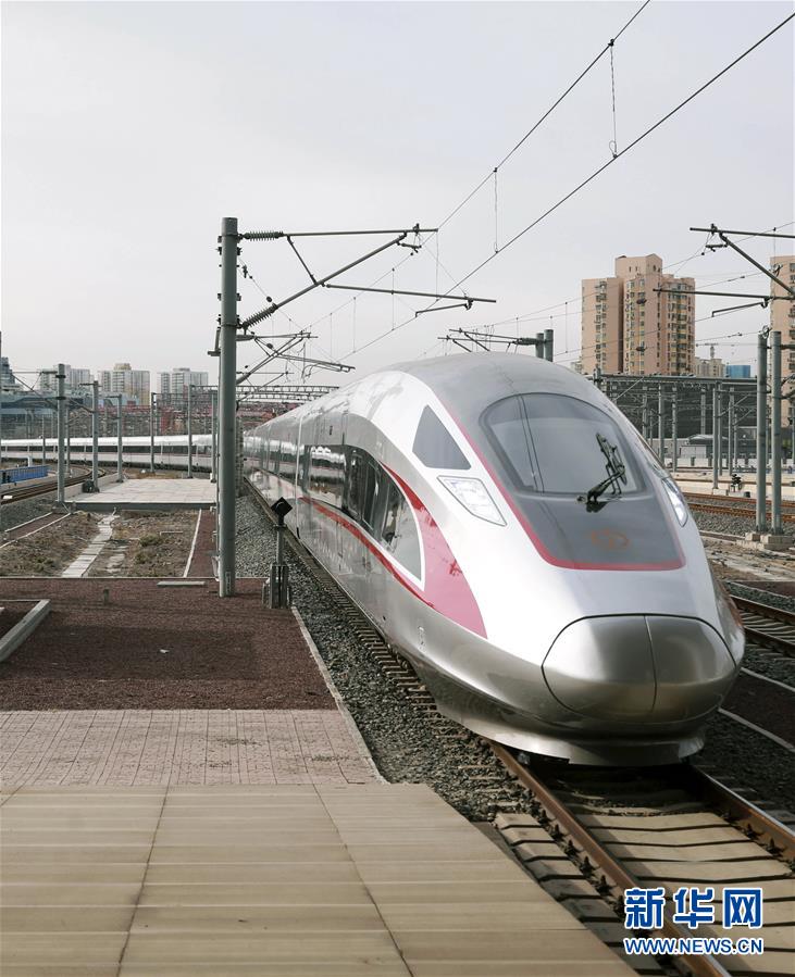 1月5日,超長版時速350公里“復興號”G9次動車組駛?cè)氡本┠险?。新華社發(fā)(陳曉根 攝)