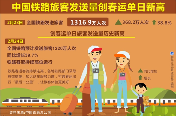 新華社北京2月24日電(記者樊曦)記者從中國鐵路總公司獲悉,2月23日,全國鐵路發(fā)送旅客1316.9萬人次,同比增加368.2萬人次,增長38.8%,創(chuàng)春運單日旅客發(fā)送量歷史新高。