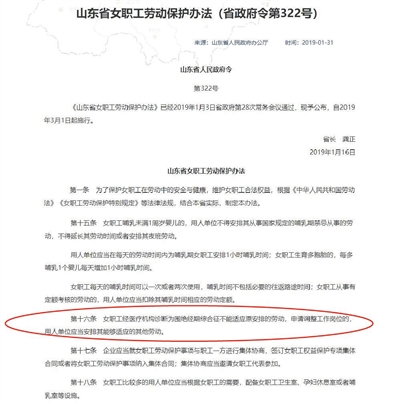 昨天,新京報(bào)記者從相關(guān)部門(mén)獲得的一份發(fā)布會(huì)文字資料顯示,為保護(hù)女職工在勞動(dòng)中的安全與健康,維護(hù)女職工合法權(quán)益,制定了《辦法》《辦法》共26條,經(jīng)山東省政府第28次常務(wù)會(huì)議通過(guò),2019年1月16日簽發(fā)公布,自2019年3月1日起施行。