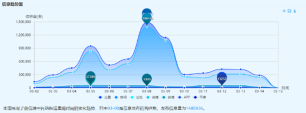 新華睿思大數(shù)據(jù)通過監(jiān)測(cè)新聞網(wǎng)站、論壇、微信、微博、APP、平媒6個(gè)信源,分析結(jié)果顯示,截至目前,全國兩會(huì)開幕以來,關(guān)于社會(huì)保障的話題共1094712個(gè)。