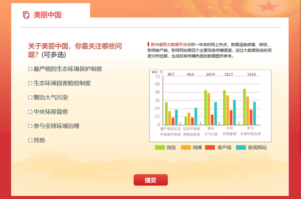 綠水青山是你我都關(guān)注的熱點(diǎn)。在新華網(wǎng)推出的2019全國兩會熱點(diǎn)調(diào)查中,新華睿思大數(shù)據(jù)通過監(jiān)測新聞網(wǎng)站、論壇、微信、微博、APP、平媒6個(gè)信源,分析結(jié)果顯示,全國兩會開幕以來,關(guān)于生態(tài)環(huán)境的話題共832 4987個(gè)。