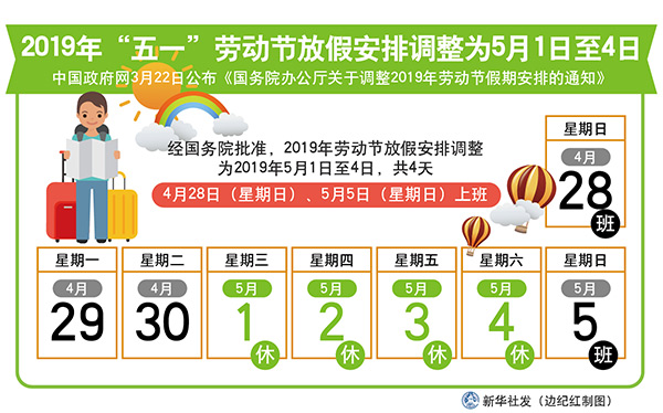 圖表:2019年“五一”勞動節(jié)放假安排調(diào)整為5月1日至4日 新華社發(fā) 邊紀(jì)紅 制圖