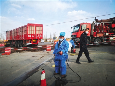 陜西省榆林市靖邊縣發(fā)生非洲豬瘟疫情后,3月9日,靖邊張家畔一公路交叉口,工作人員在交警配合下,對(duì)過往車輛噴灑消毒液。 圖/視覺中國