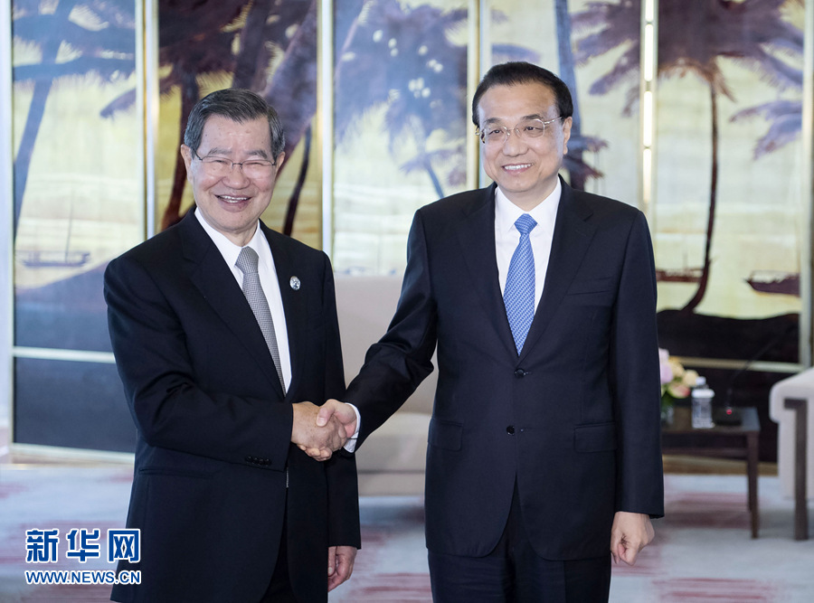3月27日,國務(wù)院總理李克強在海南博鰲會見臺灣兩岸共同市場基金會榮譽董事長蕭萬長一行。 新華社記者 李濤 攝