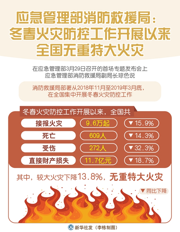 新華社北京3月29日電(記者葉昊鳴)“冬春火災防控工作開展以來,全國共接報火災9.6萬起、亡609人、傷272人、直接財產損失11.7億元,四項指數同比分別下降15.9%、14.3%、32.3%和18.7%。其中,較大火災下降13.8%,無重特大火災。”應急管理部消防救援局副局長瓊色說。