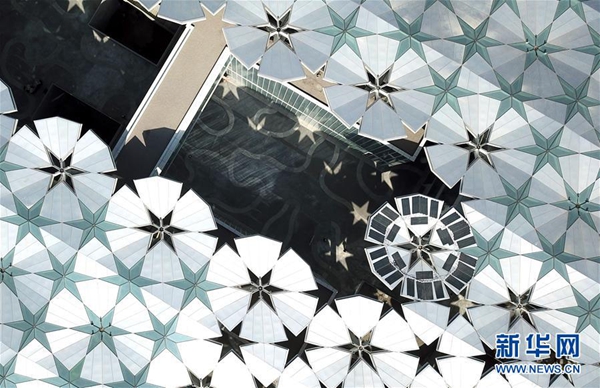 3月26日無人機(jī)拍攝的北京世園會(huì)園區(qū)“小行星”效果圖,位于畫面中心的建筑是中國館(電腦合成)。新華社記者 王建華 攝