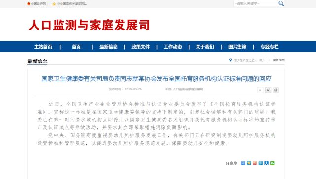 近日,全國衛(wèi)生產(chǎn)業(yè)企業(yè)管理協(xié)會標(biāo)準(zhǔn)與認(rèn)證專業(yè)委員會發(fā)布了《全國托育服務(wù)機構(gòu)認(rèn)證標(biāo)準(zhǔn)》,宣稱這一標(biāo)準(zhǔn)是在國家衛(wèi)生健康委領(lǐng)導(dǎo)的支持下制定的,引起社會誤解和有關(guān)部門的質(zhì)疑。我委已在第一時間要求該機構(gòu)立即停止以國家衛(wèi)生健康委名義組織開展托育服務(wù)機構(gòu)認(rèn)證標(biāo)準(zhǔn)的宣傳推廣及認(rèn)證試點等后續(xù)活動,并要求其立即采取措施消除負(fù)面影響。