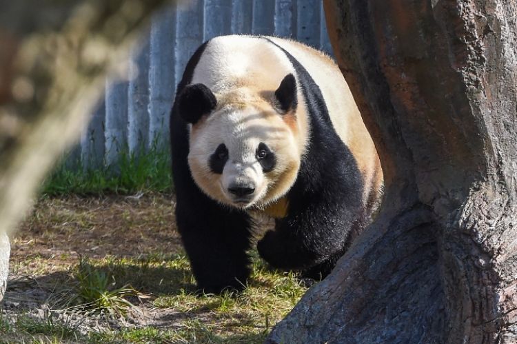 這是4月10日在丹麥哥本哈根動物園熊貓館拍攝的大熊貓“毛二”。(新華社記者 郭晨 攝)
