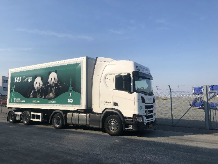 4月4日,在丹麥首都哥本哈根的凱斯楚普國際機場,一輛印有歡迎“星二”和“毛筍”(“毛二”的乳名)來哥本哈根字樣的集裝箱卡車等待運送大熊貓。(新華社發(fā) 何李杰攝)