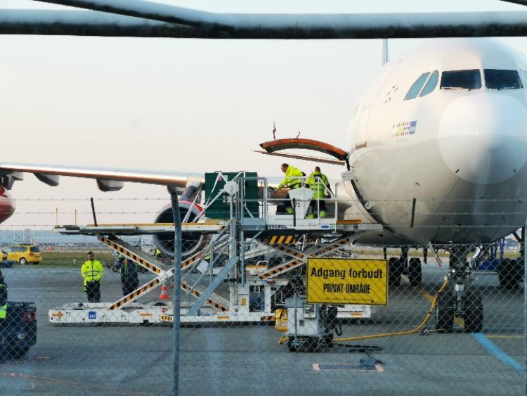 4月4日,在丹麥首都哥本哈根的凱斯楚普國際機場,工作人員將裝有中國大熊貓的箱子搬出,準備運往哥本哈根動物園。(新華社發(fā) 李鵬飛攝)