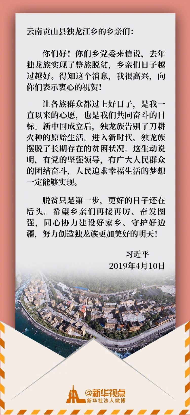 2018年,獨(dú)龍江鄉(xiāng)6個(gè)行政村整體脫貧,獨(dú)龍族實(shí)現(xiàn)整族脫貧。當(dāng)?shù)厝罕娢朽l(xiāng)黨委給習(xí)近平總書記寫信,匯報(bào)獨(dú)龍族實(shí)現(xiàn)整族脫貧的喜訊,表達(dá)了繼續(xù)堅(jiān)定信心跟黨走、為建設(shè)好家鄉(xiāng)同心奮斗的決心。