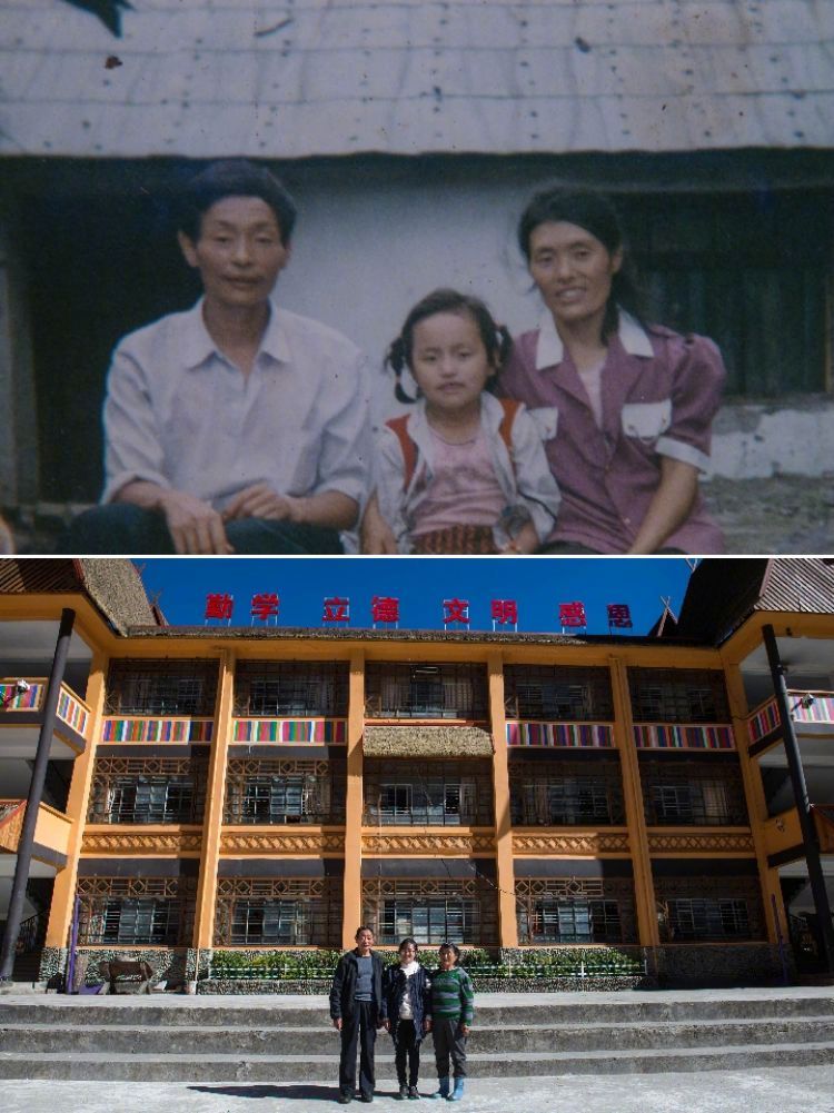 拼版照片,上圖:1993年在獨(dú)龍江鄉(xiāng)小學(xué)拍攝的獨(dú)龍族群眾高德生、高瓊先和黎英(從左到右)一家三口(資料照片);下圖:2016年11月23日在獨(dú)龍江鄉(xiāng)中心小學(xué)拍攝的獨(dú)龍族群眾高德生、高瓊先和黎英一家(從左到右)