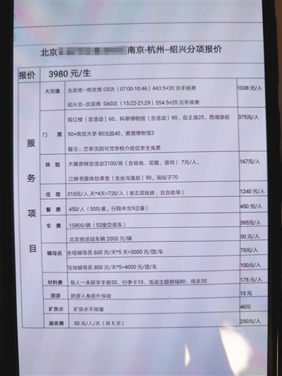 海淀區(qū)某中學則向家長公開了收費明細。在家長王先生提供的游學清單上,記者看到5天的研學旅行費用為3980元,游覽地點包括南京大屠殺遇難同胞紀念館、西湖和魯迅紀念館等。行程中還設置了眾多教育內(nèi)容,比如參加南京大學講座、著漢服行謝師禮、探究杭州西湖的光學現(xiàn)象等。