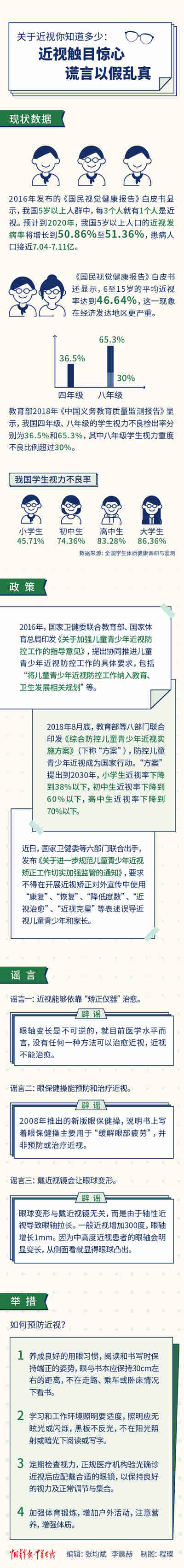事實上,我國防控近視的舉措早已開始。2007年《中共中央國務(wù)院關(guān)于加強青少年體育增強青少年體質(zhì)的意見》(中發(fā)[2007]7號)發(fā)布后,《中小學(xué)學(xué)生近視眼防控工作方案》就對保護學(xué)生視力提出了工作措施,包括保證睡眠、建立視力定期檢測制度、堅持每天一小時體育鍛煉制度等。