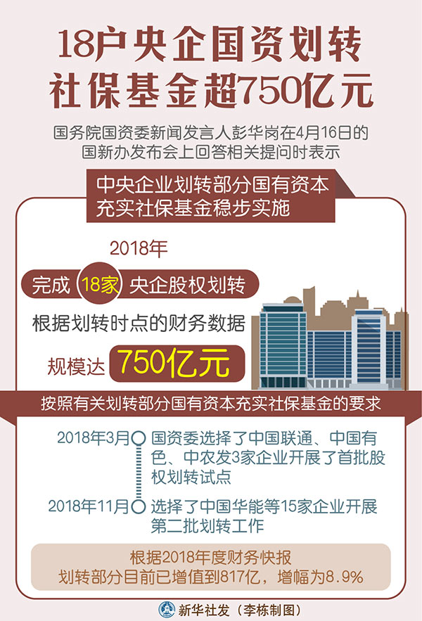 新華社北京4月16日電(記者王希)國務院國資委新聞發(fā)言人彭華崗16日說,中央企業(yè)劃轉部分國有資本充實社?;鸱€(wěn)步實施,2018年完成18家央企股權劃轉,根據(jù)劃轉時點的財務數(shù)據(jù),規(guī)模達750億元。