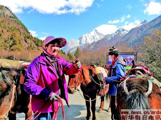 有“東方阿爾卑斯山”之稱的四姑娘山,位于四川阿壩藏族羌族自治州小金縣境內(nèi),與“大熊貓的故鄉(xiāng)”——臥龍自然保護區(qū)接壤。由于生態(tài)環(huán)境保護的特殊性,不少觀光地點車輛無法進入,只能徒步穿越或者騎馬進山,馬匹具有十分重要地位?!耙婚_始,我一個人牽馬,沒有統(tǒng)一的組織和管理,一天有時候只能掙三四十元,有的游客還擔心是否安全,不敢坐?!痹鞲嬖V記者,村里統(tǒng)一管理以后,村民接受了專業(yè)培訓、收費透明,選擇坐馬穿越長坪溝和海子溝的游客越來越多。如今,長坪村有牽馬師700余人,牽馬成為村民重要的收入來源。