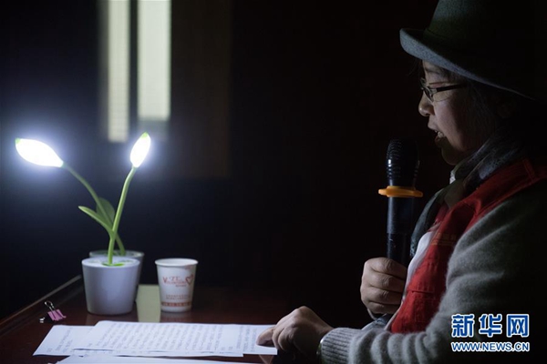 4月11日,吳素環(huán)在中國盲文圖書館桐廬縣支館為視障人士解說電影《可可西里》。新華社記者 翁忻旸 攝
