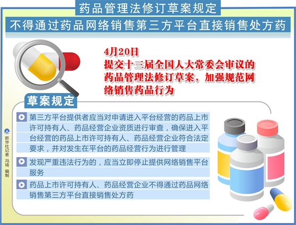 新華社北京4月20日電(記者趙文君)20日提交十三屆全國人大常委會(huì)審議的藥品管理法修訂草案,加強(qiáng)規(guī)范網(wǎng)絡(luò)銷售藥品行為,明確不得通過藥品網(wǎng)絡(luò)銷售第三方平臺(tái)直接銷售處方藥。