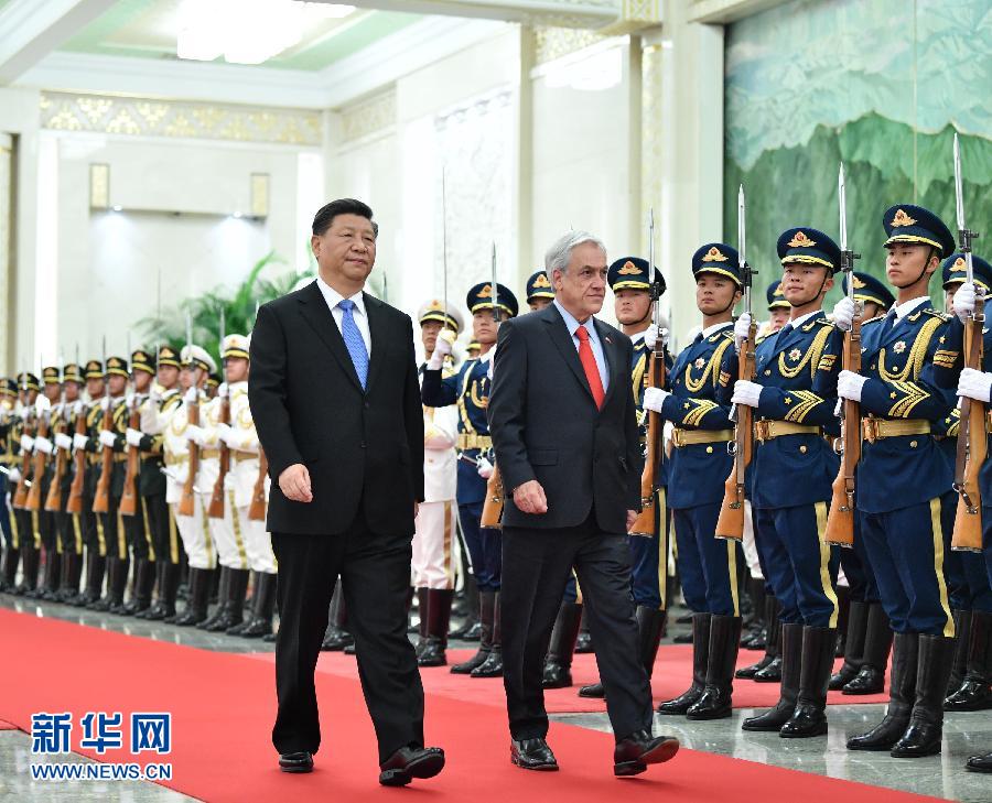4月24日,國(guó)家主席習(xí)近平在北京人民大會(huì)堂同智利總統(tǒng)皮涅拉舉行會(huì)談。這是會(huì)談前,習(xí)近平在人民大會(huì)堂北大廳為皮涅拉舉行歡迎儀式。 新華社記者 殷博古 攝