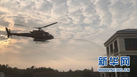 圖為消防直升機(jī)對著火建筑進(jìn)行滅火水劑噴射。新華網(wǎng) 黃浩攝