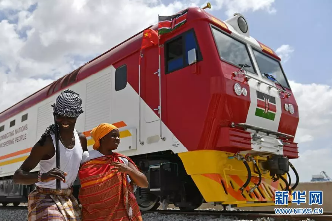 2017年1月11日,在肯尼亞蒙巴薩,當(dāng)?shù)孛癖娫谥袊兄频拿蓛?nèi)鐵路首批內(nèi)燃機車旁載歌載舞。新華社記者孫瑞博攝